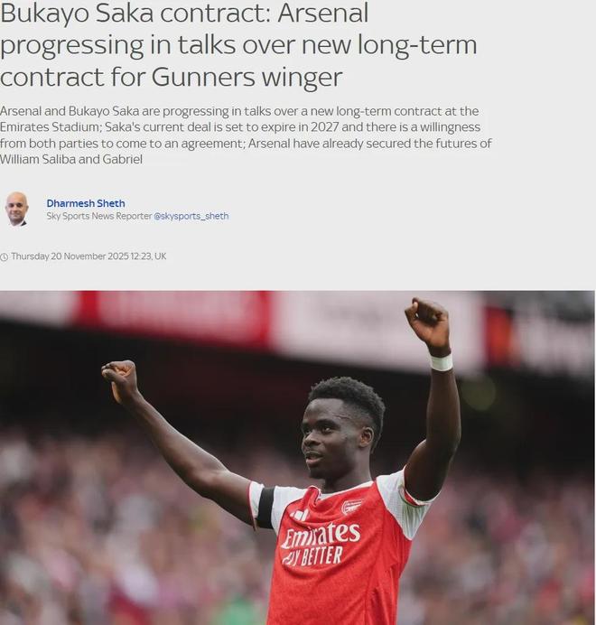萨卡当下的合同2027年到期,报道称续约谈判正在进行中,双方现在都有信心在短期内达成协议。